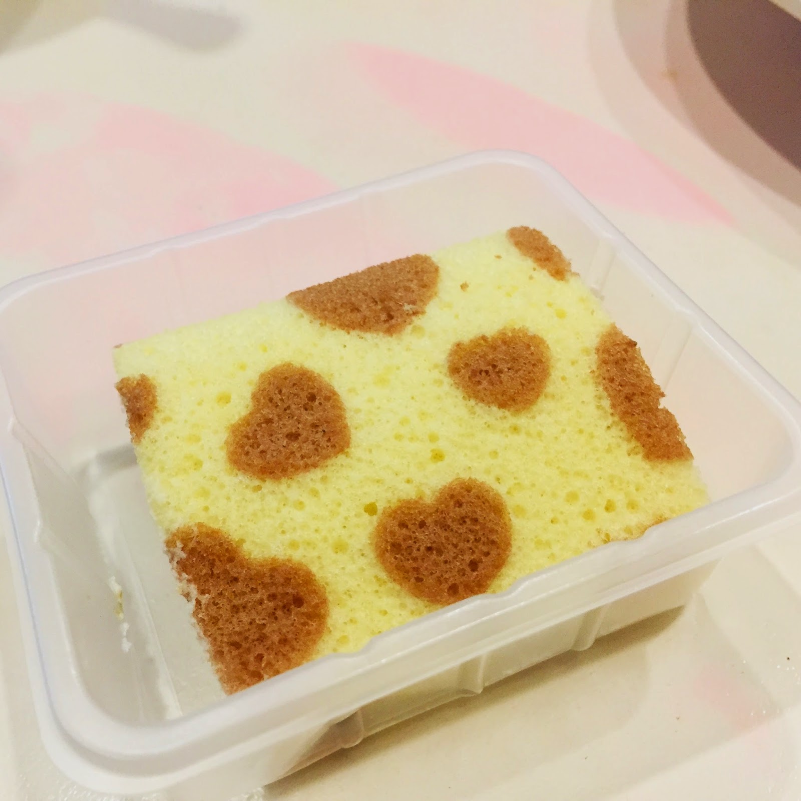 Some japanese pudding omelette. Looks more like a giraffe sponge cake with heart-shaped spots. #japanesesnacks #heartshape #cute #giraffeprint