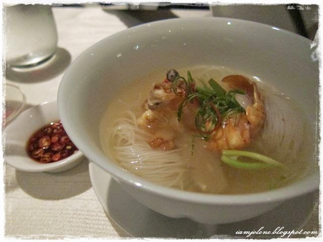 OUR ultimate favourite dish for the night was this langouste bee hoon! I had craving for the broth for the next few days and kh was upset that this isn't available on their à la carte menu. I simply do not know how to describe this dish. Yes it is bee hoon only ma... Something so easy to cook, something that could be gotten from hawker centres and even in instant mee packets but this bee hoon is just so DAMN GOOD that I do not have refined words to describe this dish. Think of it as a bee hoon that is more delicate, more refined and clean. Think of it as a soup without the oily feel yet so full of robust flavour that is savoury yet not salty. Think of it as a superior broth made using the freshest ingredients that is so full of natural goodness.